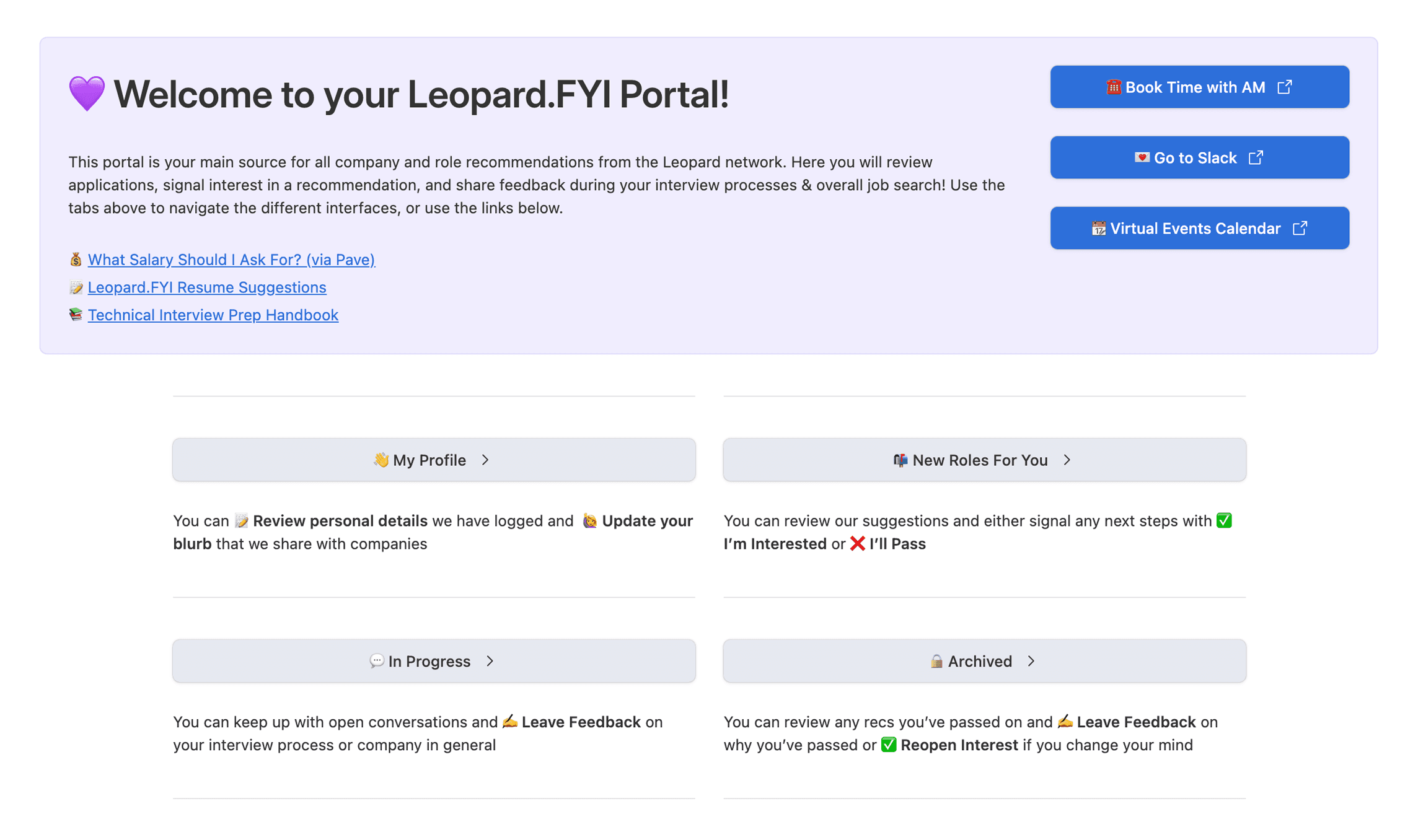 When you join the Leopard.FYI network, you'll initially have a zoom call with one of our founders where we'll start by defining what a "better opportunity" means for you (improved compensation, company culture, etc.). Where it gets different is how we use this information. We use it to proactively identify and connect with companies that fit your criteria. Our team will find and email companies, confirm that there's a match on preferences, and share the information we've gathered to determine if it's a good fit. From there, you'll have an open line to the team for support around negotiation, scheduling, and anything else you need <3